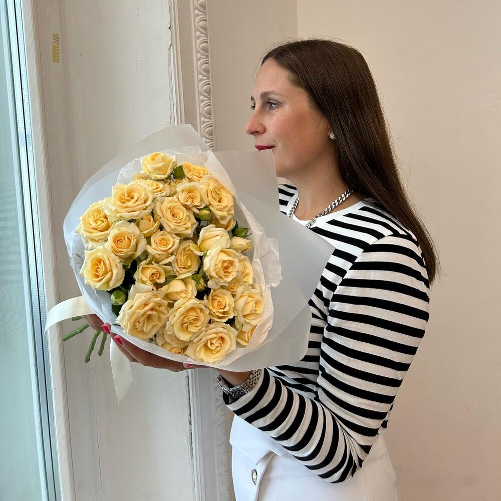 Кустовая роза – 5 шт.Лента атласная – 1 шт.Дизайнерская упаковка – 1 шт.