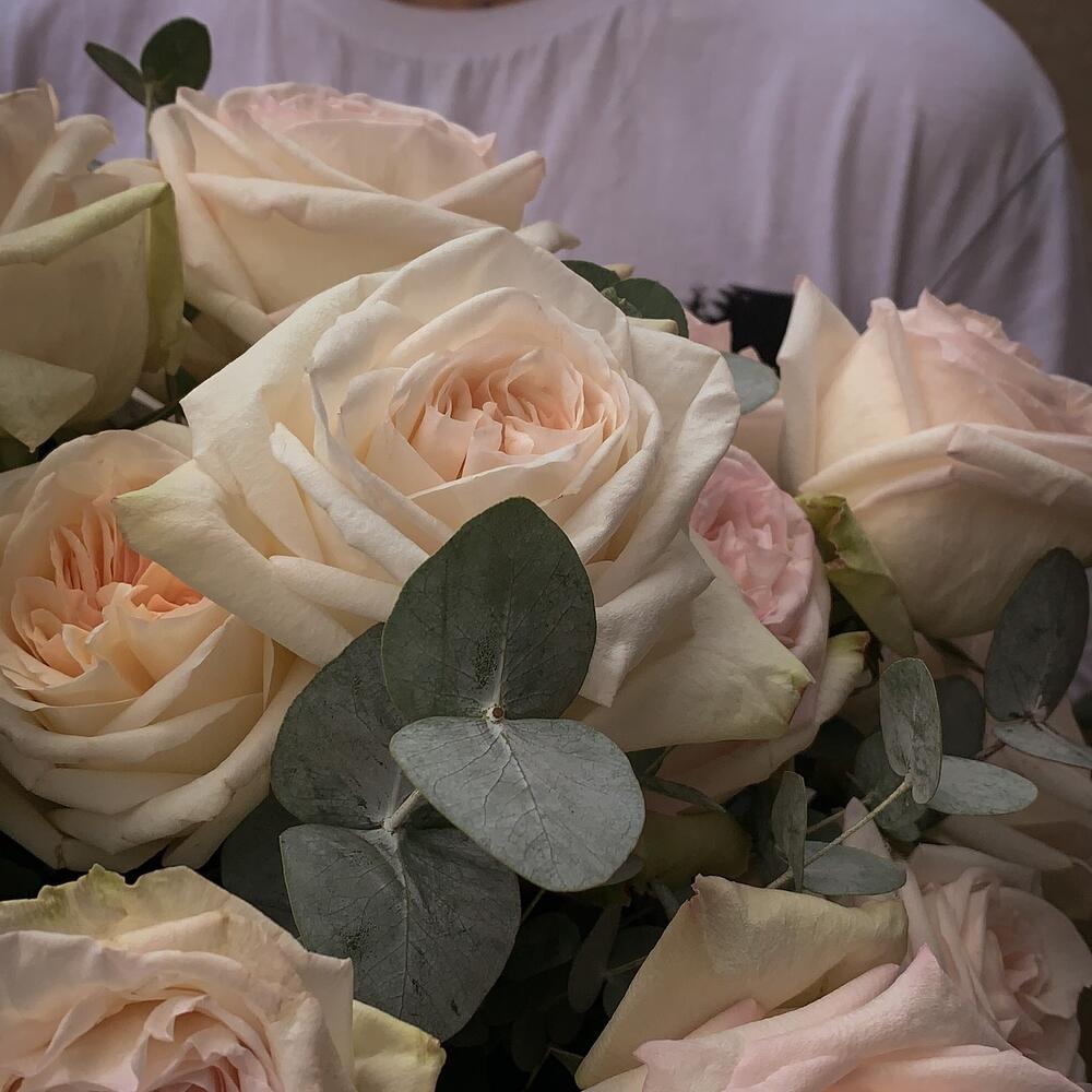 Роза пионовидная – 23 шт.Эвкалипт – 17 шт.Тишью – 2 шт.Корзина плетеная – 1 шт.