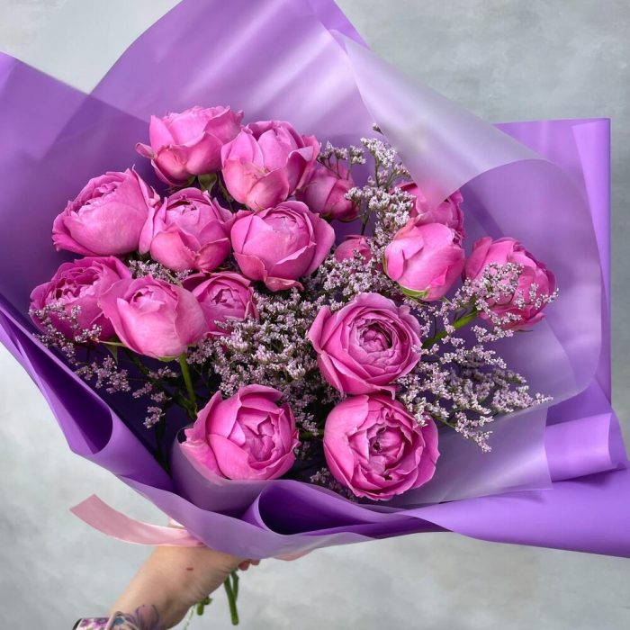 Лимониум – 2 шт.Лента атласная – 1 шт.Роза кустовая пионовидная – 5 шт.Упаковка пленка матовая – 2 шт.