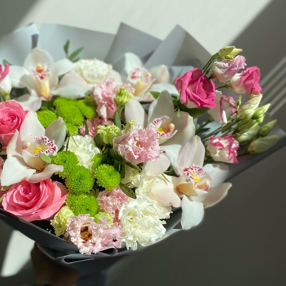 Орхидея Цимбидиум – 5 шт.Зелень – 8 шт.Роза Эквадор – 3 шт.Лента атласная – 3 шт.Упаковка дизайнерская – 9 шт.Сантини зеленая – 4 шт.Диантус сортовой – 5 шт.эустома лизиантус – 5 шт.
