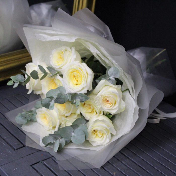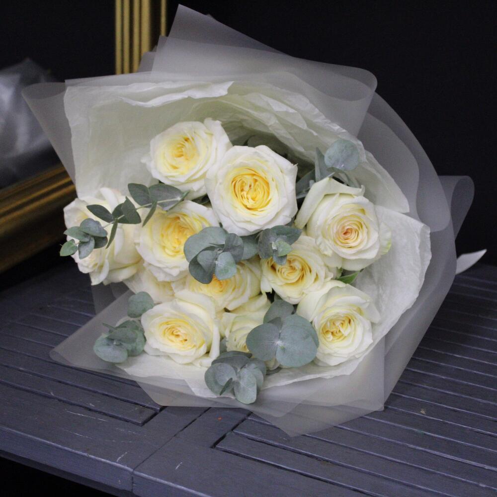 Эвкалипт – 3 шт.Лента атласная – 2 шт.Пленка матовая – 5 шт.роза пионовидная кэндллайт – 11 шт.