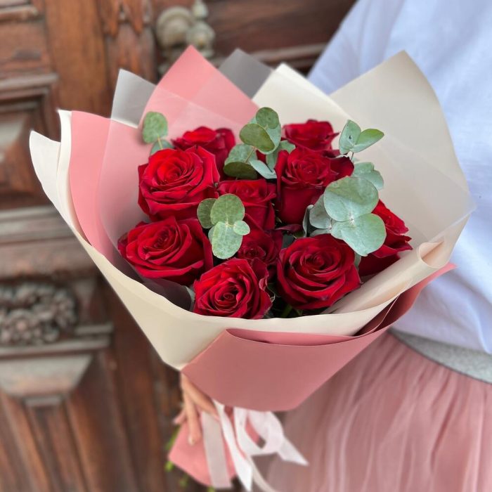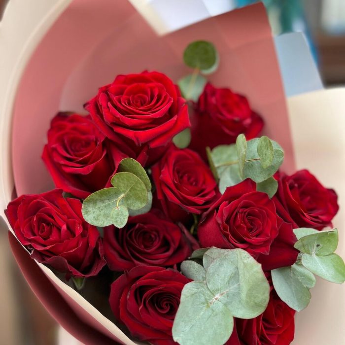 mono bouquet 56 из 11 роз сорта Mondial с эвкалиптом