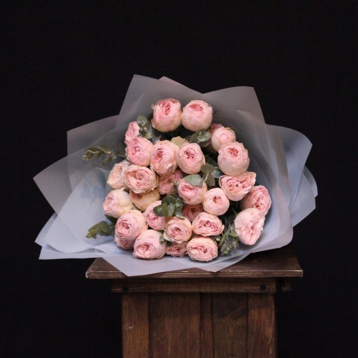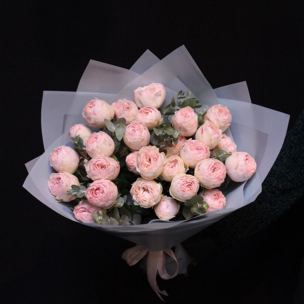 mono bouquet 94 из 7 Пионовидных кустовых роз Mansfield Park + эвкалипт