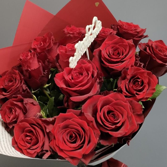 Роза Эквадор Красная – 15 шт.Пленка – 1 шт.Топпер – 1 шт.