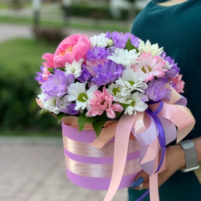 Хризантема кустовая – 7 шт.Коробка шляпная – 1 шт.Лента атласная – 5 шт.Роза – 1 шт.
