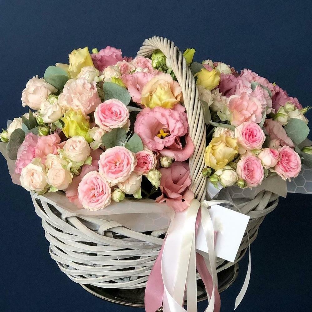 Корзина – 1 шт.Роза кустовая – 10 шт.Эвкалипт – 1 шт.Эустома – 5 шт.Оазис – 1 шт.