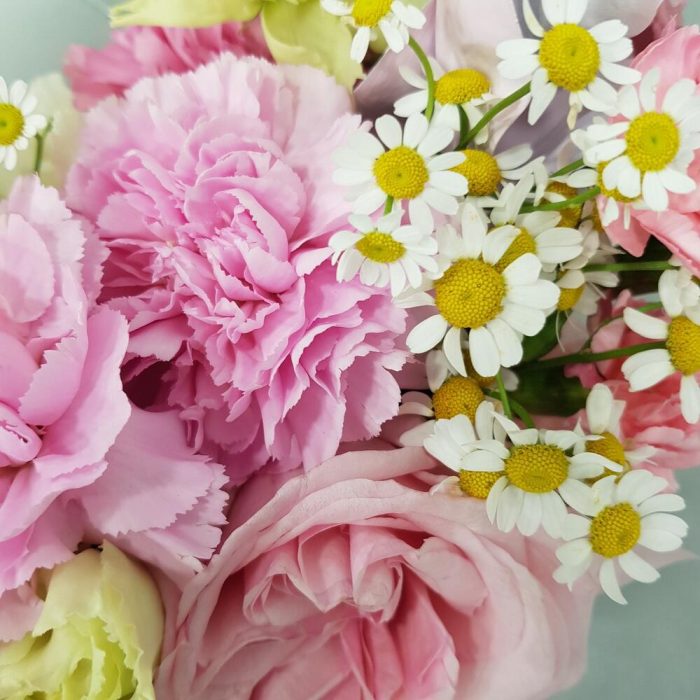 Роза пионовидная – 1 шт.Диантус – 4 шт.Диантус кустовой – 1 шт.Лизиантус – 1 шт.Матрикария – 1 шт.Коробка шляпная – 1 шт.Тишью – 1 шт.