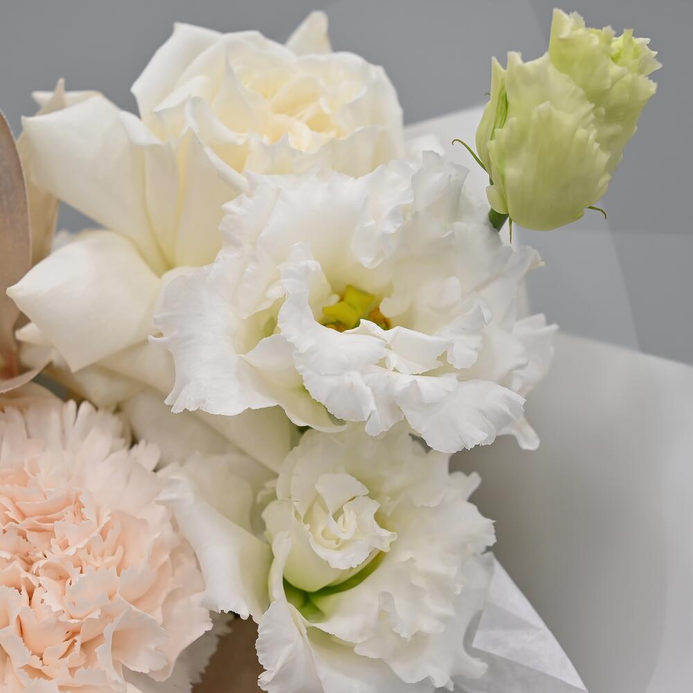 Французская роза – 2 шт.эустома белая – 1 шт.Лист магнолии – 2 шт.Гвоздика – 2 шт.Роза кустовая – 1 шт.Рускус – 2 шт.Упаковка дизайнерская – 2 шт.