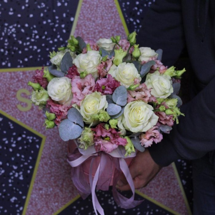 Роза Мондиаль – 9 шт.эустома махровая – 5 шт.Эвкалипт – 2 шт.Пленка дизайнерская – 1 шт.Оазис флористический – 1 шт.Лента атласная – 2 шт.Шляпная коробка – 1 шт.