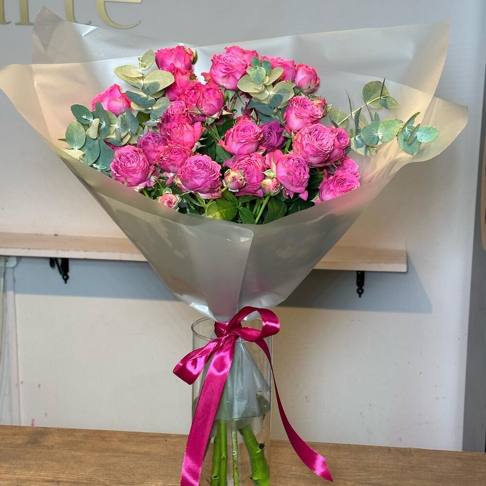 Эвкалипт – 1 шт.Лента атласная – 1 шт.Упаковка дизайнерская – 1 шт.Пионовидная кустовая роза – 5 шт.