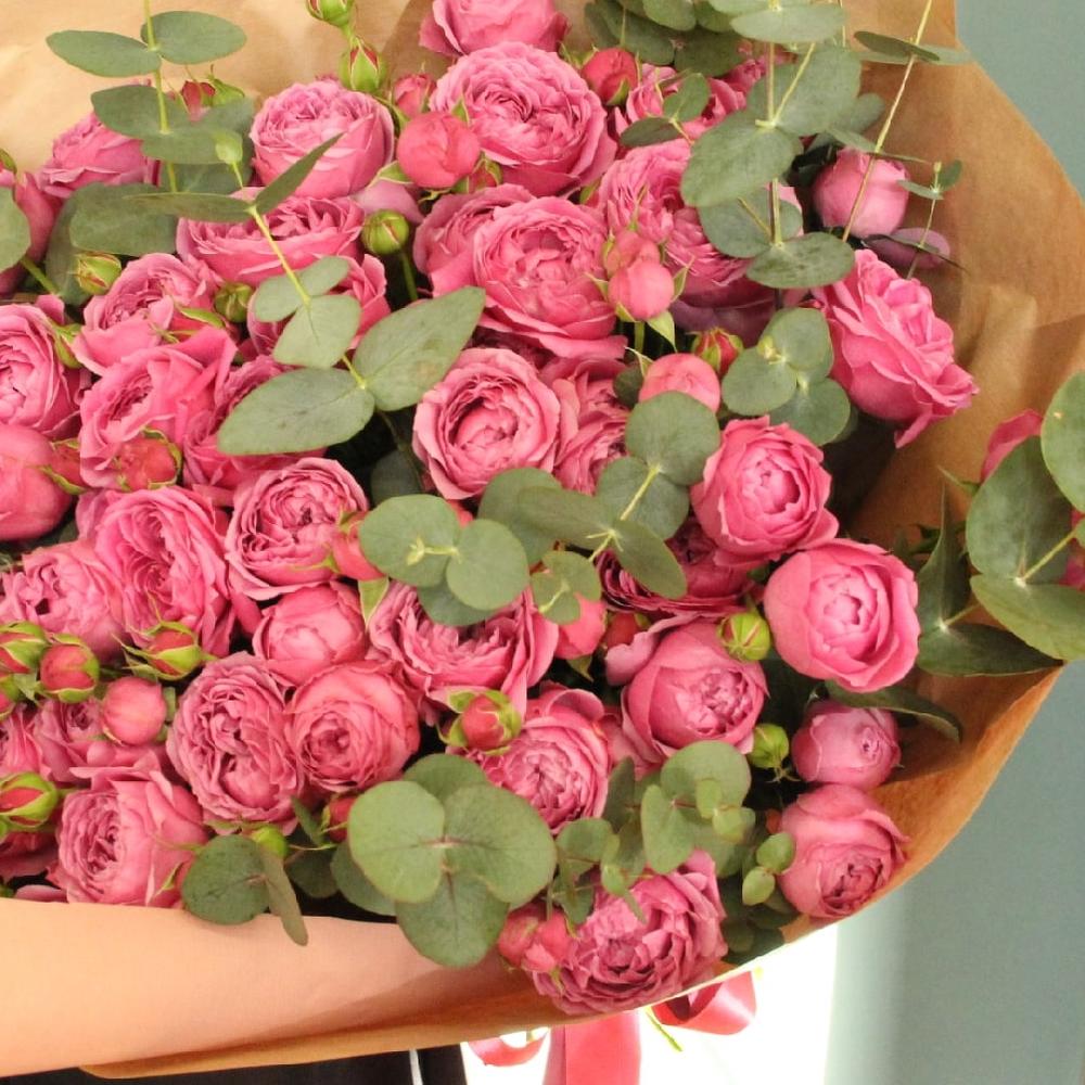 Восхитительный огромный букет из пятнадцати кустовых пионовидных роз малинового цвета и веточками ароматного эвкалипта.Ширина букета около 50 смВысота букета около 60 смСтильное цветочное решение для любого случая.