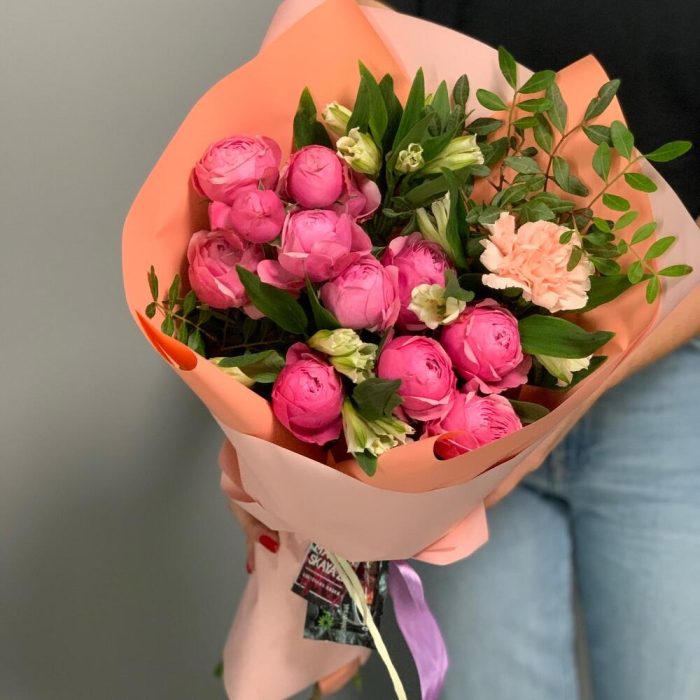 Милый приятный букет с пионовидной кустовой розой, Котора напоминает лето и Тепло, альстромерия и гвоздичка, которая стоит до 2-3 недель и писташ, освежающая букет подарят радость родному человеку для продления жизни цветочков мы добавляем кризал к букету
