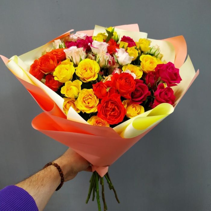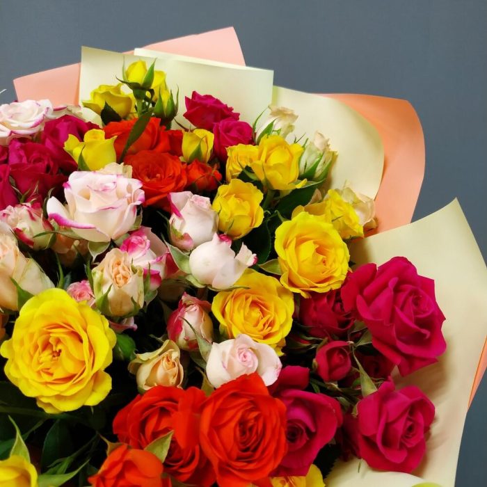Все женщины любят цветы, но большинство из них предпочитает розы. Еще бы, ведь они завораживают своей красотой и покоряют своим ароматом.Прекрасный букет из кустовых роз, станет идеальным подарком для самых любимых и близких!Памятка для букета:1. Чистая вода раз в сутки.2. Стебли подрезаем на 0,5см при каждой смене воды.3. Ставим в прохладное место, но не у окна.4. Чтобы вода оставалась свежей, не допускайте попадания листьев и лепестков в воду.Друзья, обратите внимание, что цвет упаковки может быть другим, в зависимости от наличия на складе.