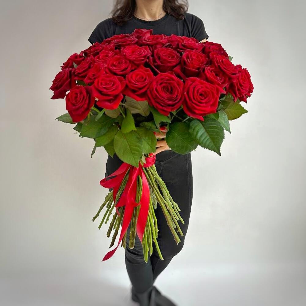 Розы красные (80 см) с атласной лентой, букет размера XL