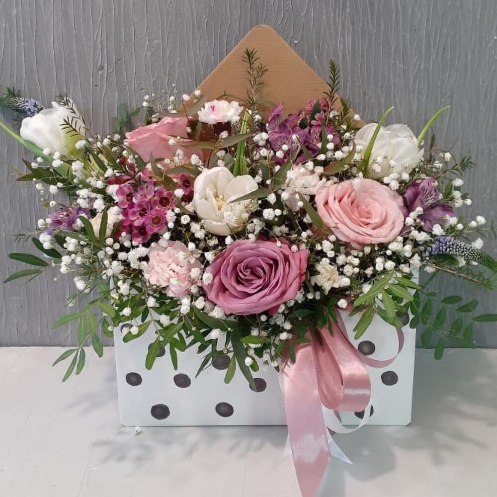 Свежие цветы в конверте, внутри которого флористическая губка с водой не требуют полива и вазы.Чудесный и очень позитивный весенний конверт!