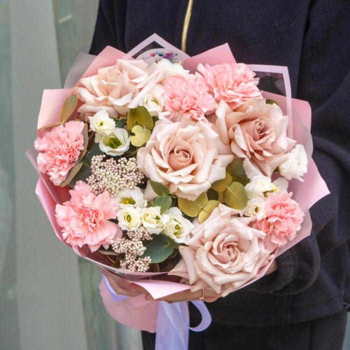 Сборный букет с французскими розами и гвоздикамм в пудровых оттенках