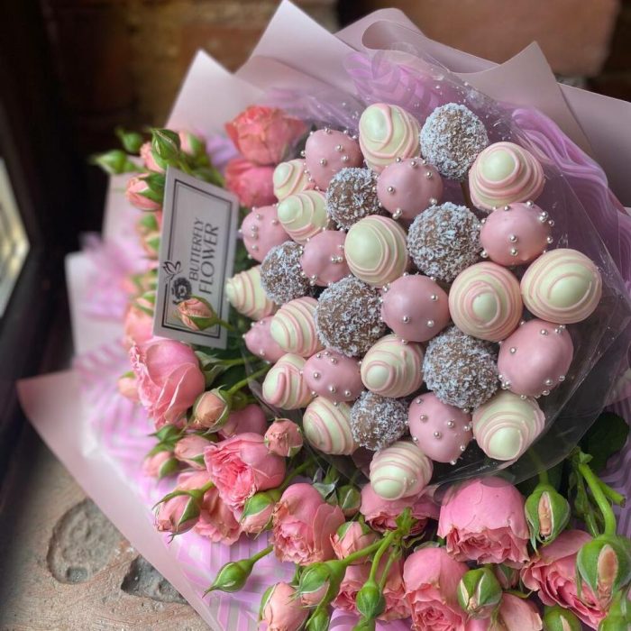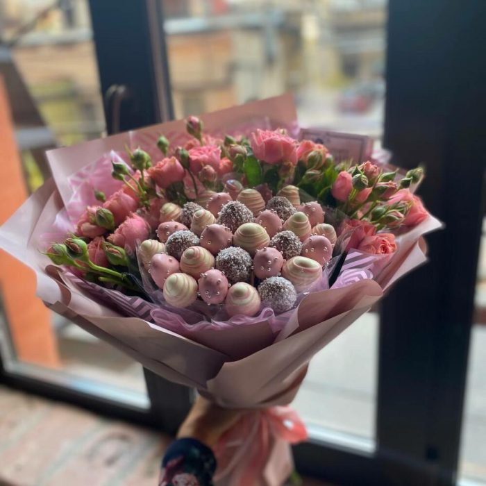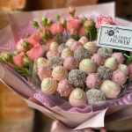 Съедобный фруктовый букет из клубники в шоколаде и эустомы в дизайнерской упаковке