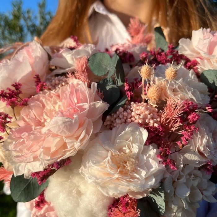 роза стабилизированная пионовидная крупная – 3 шт.роза стабилизированная пионовидная мелкая – 6 шт.гортензия стабилизированная пучок – 6 шт.эвкалипт стабилизированный ветка – 1 шт.папоротник стабилизированный лист – 2 шт.лимониум стабилизированный пучок – 1 шт.аспарагус стабилизированный пучок – 1 шт.эрингиум стабилизированный пучок – 1 шт.озотамнус стабилизированный пучок – 3 шт.Шляпная коробка с лентами – 1 шт.