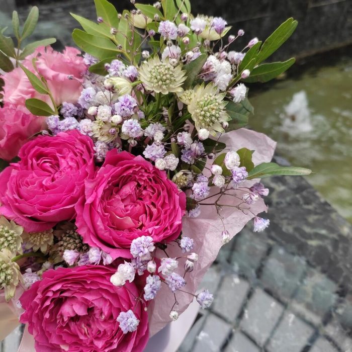 Лизиантус – 1 шт.Роза кустовая – 1 шт.Гипсофила – 1 шт.Астранция – 1 шт.Фисташка – 2 шт.Тишью – 1 шт.коробка 12*12 – 1 шт.