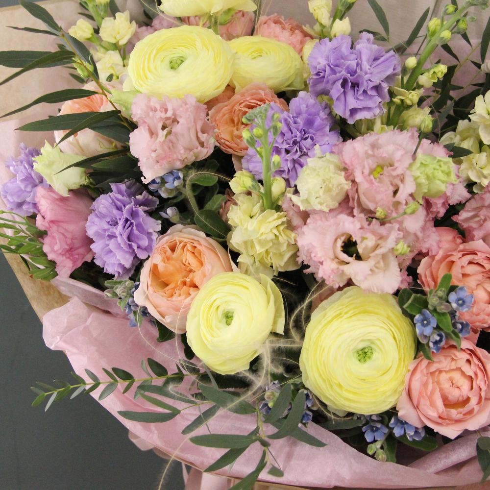 Авторский букет с ранункулюсами, пионовидными розами, ароматными маттиолами, диантусом, твидией, лизиантусом и эвкалиптом.Ширина букета около 70 сантиметров, высота букета около 60 сантиметров.Стильное цветочное решение для любого случая.Отличный выбор для подарка … Показать ещёна день всех влюблённых, 14 февраля.