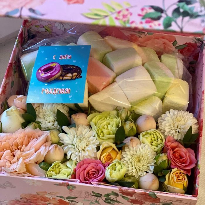 Кустовая роза – 4 шт.Зелень – 1 шт.Оазис – 1 шт.Коробка – 1 шт.Маршмеллоу – 100 гр.Одноголовая роза – 3 шт.
