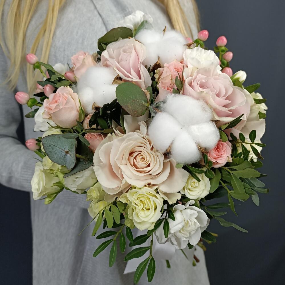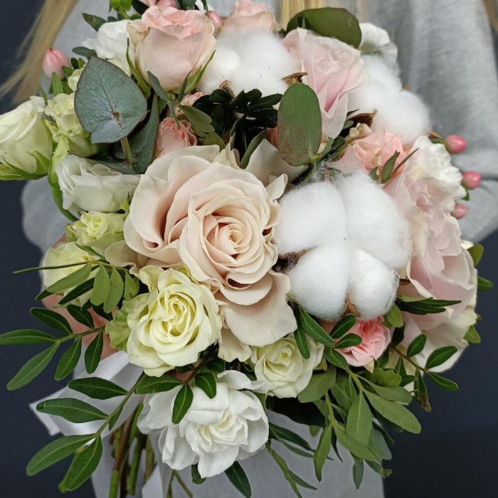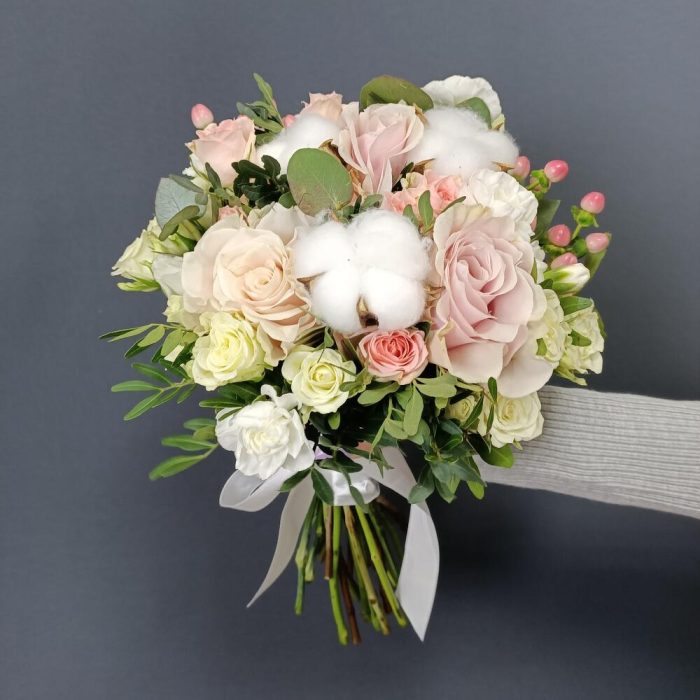 Роза пинк мондиаль – 5 шт.Роза кустовая – 7 шт.Хлопок – 3 шт.Хиперикум – 2 шт.Лизиантус – 2 шт.Гвоздика кустовая – 2 шт.Фисташка – 3 шт.Лента атласная – 3 шт.