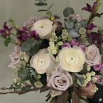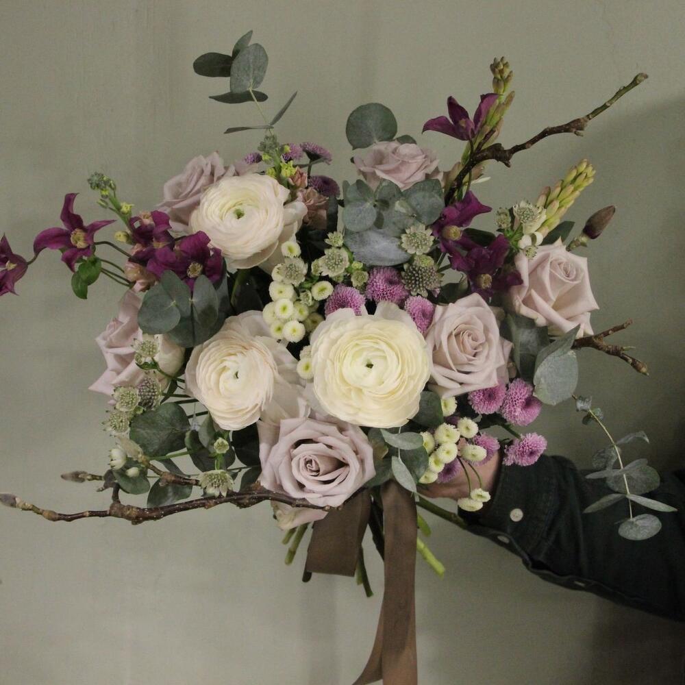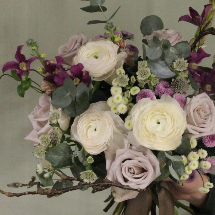 Букет с характером и душистым нежным составом, ветки, ранункулюсы, клематис, тубероза, сантини, эвкалиптом, розами и астранцией.