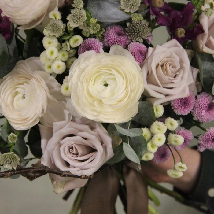Ранункулюс – 3 шт.Клематис – 2 шт.Тубероза – 2 шт.Маттиола – 3 шт.Астранция – 2 шт.Роза сортовая – 5 шт.Сантини – 5 шт.Ветки – 2 шт.Эвкалипт – 5 шт.