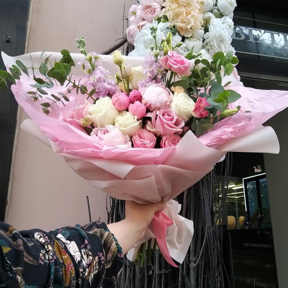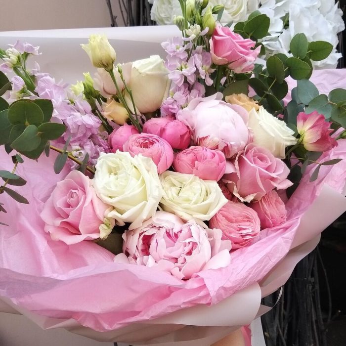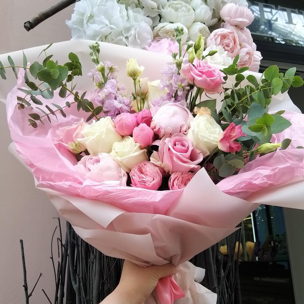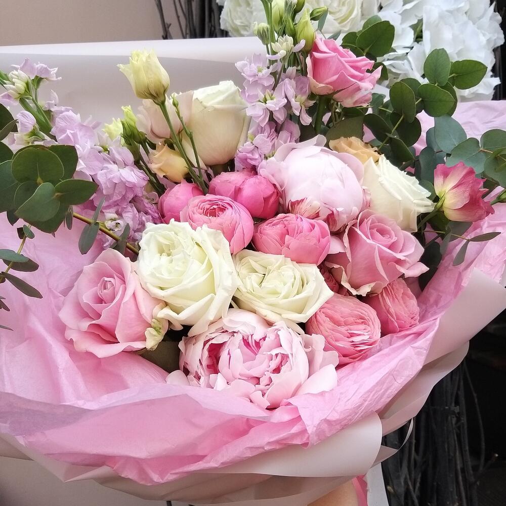пионовидная роза кустовая Misty Bubbles – 2 шт.Пион – 2 шт.Роза белая – 4 шт.Маттиола – 2 шт.Роза розовая – 3 шт.Лизиантус розовый – 1 шт.Эвкалипт – 3 шт.