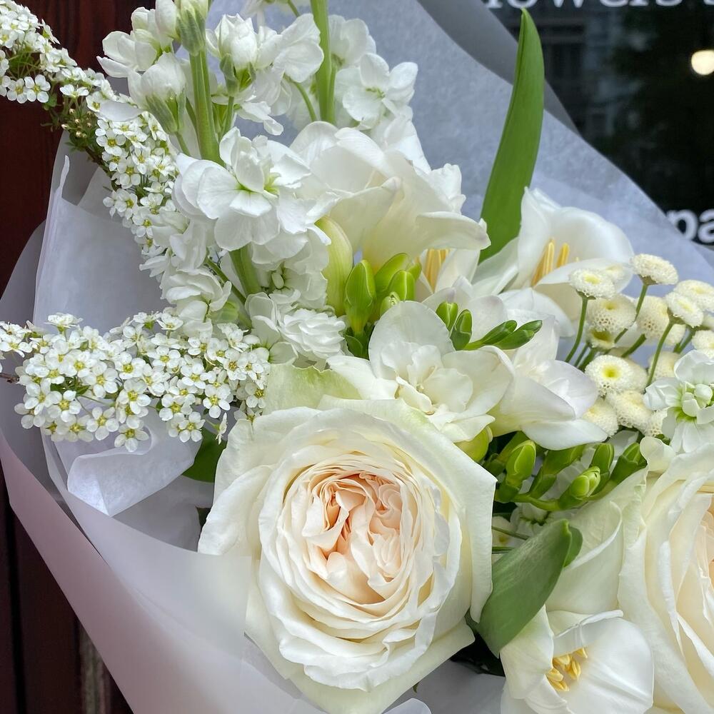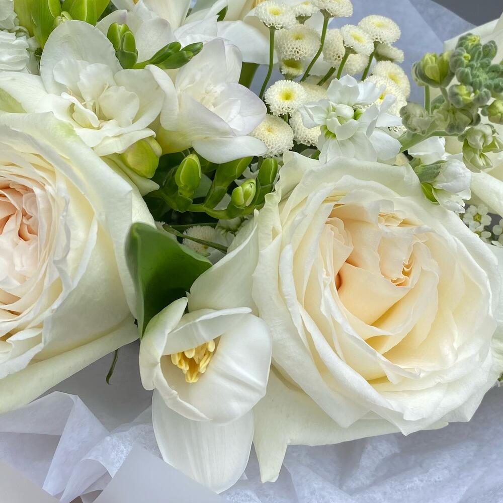 Лента атласная – 1 шт.Фрезия белая – 2 шт.Упаковка дизайнерская – 3 шт.Маттиола белая – 3 шт.тюльпан белый голландия – 3 шт.роза white o’hara – 3 шт.спирея ветви – 3 шт.