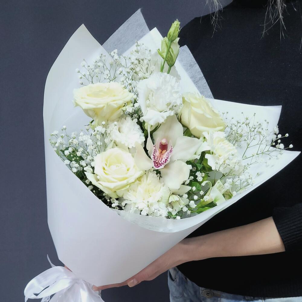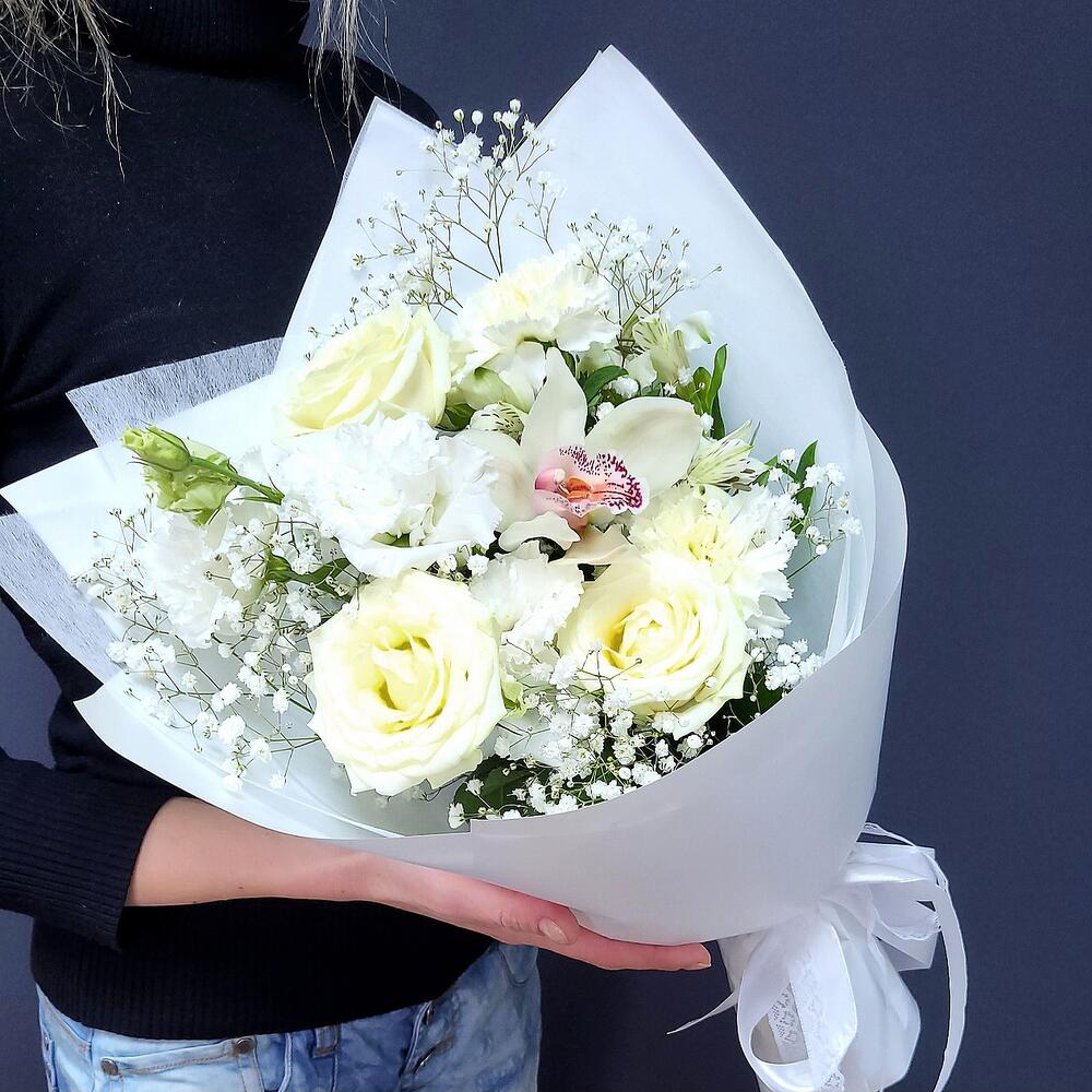 Альстромерия – 1 шт.Гипсофила – 1 шт.Лизиантус – 1 шт.Орхидея Цимбидиум – 1 шт.Роза кустовая – 1 шт.Роза – 3 шт.Гвоздика – 2 шт.Упаковка дизайнерская – 1 шт.