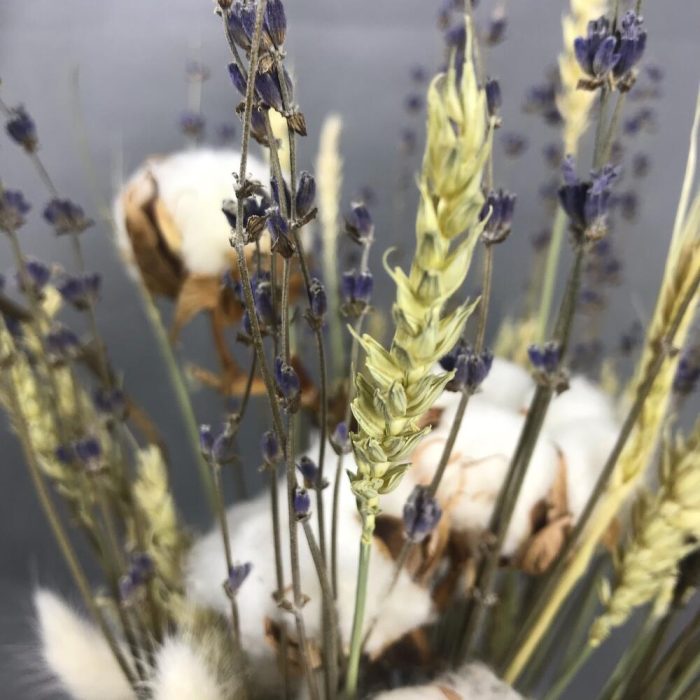 Хлопок натуральный – 7 шт.Лаванда (сухоцвет) – 40 шт.Пшеница (сухоцвет) – 30 шт.Коробка шляпная – 1 шт.ларгус – 5 шт.