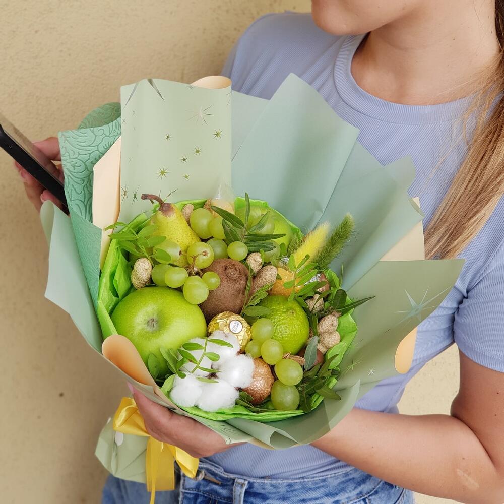 Витаминный букет с летним настроением. А для любителей необычных вкусняшек, мы добавили в эту модель манговые конфетки! Не пробовали? Это очень вкусно !!!