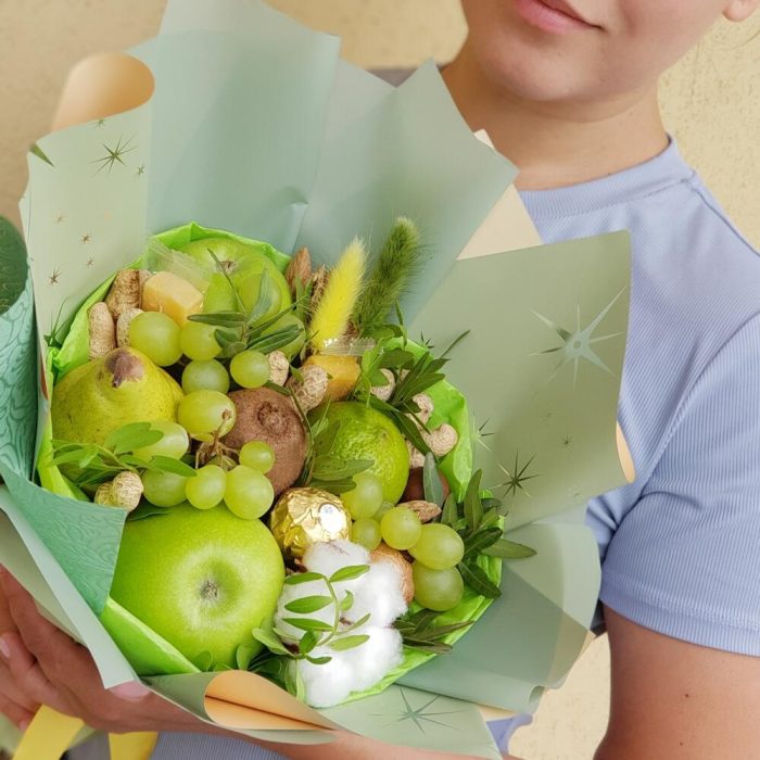 Виноград – 70 гр.Киви – 1 шт.Лайм – 1 шт.Груша – 1 шт.Миндаль – 10 гр.Арахис – 20 гр.коробка транспортировочная – 1 шт.грецкие орехи – 35 гр.яблоки – 2 шт.манговые конфеты – 2 шт.Конфеты Ferrero Rocher – 40 гр.орех макадамия в скорлупе – 1 шт.Хлопок – 1 шт.Лагурус (сухоцвет) – 2 шт.декоративная зелень – 1 шт.