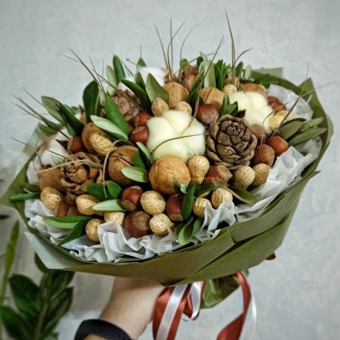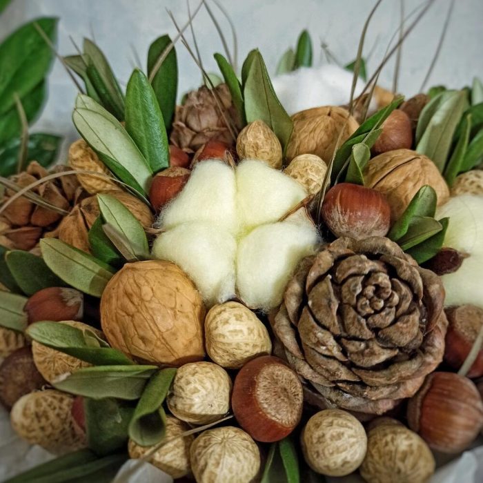Хлопок искусственный – 5 шт.арахис в скорлупе – 35 шт.фундук в скорлупе – 40 шт.грецкий орех в скорлупе – 13 шт.шишка кедровая с орешками – 5 шт.олива (зелень) – 1 шт.робелини (зелень) – 1 шт.