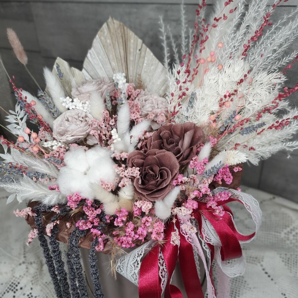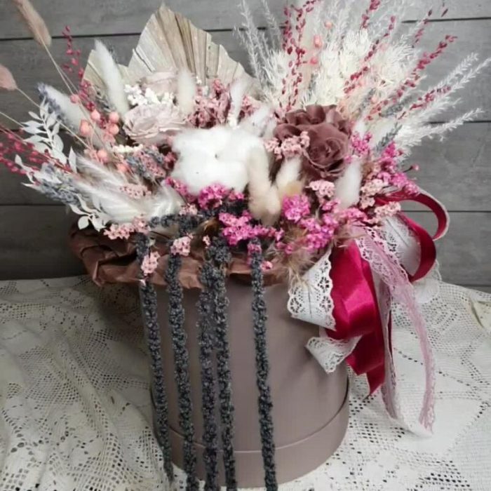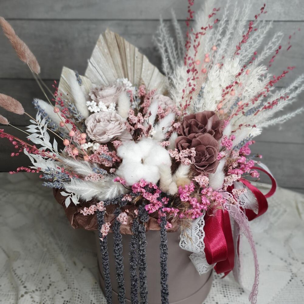 стабилизированные розы – 5 шт.аурея белая – 2 шт.Хлопок натуральный – 1 шт.Лагурус – 16 шт.лен сухоцвет – 3 шт.бриза пучок – 2 шт.копье пальмы – 1 шт.амарант стабилизированный – 5 шт.статица стабилизированная – 9 шт.рускус стабилизированный выбеленный – 1 шт.сорго – 3 шт.лавандин пучок – 1 шт.аспарагус стабилизированный выбеленный – 1 шт.Шляпная коробка – 1 шт.Лента – 2 шт.Тишью – 1 шт.