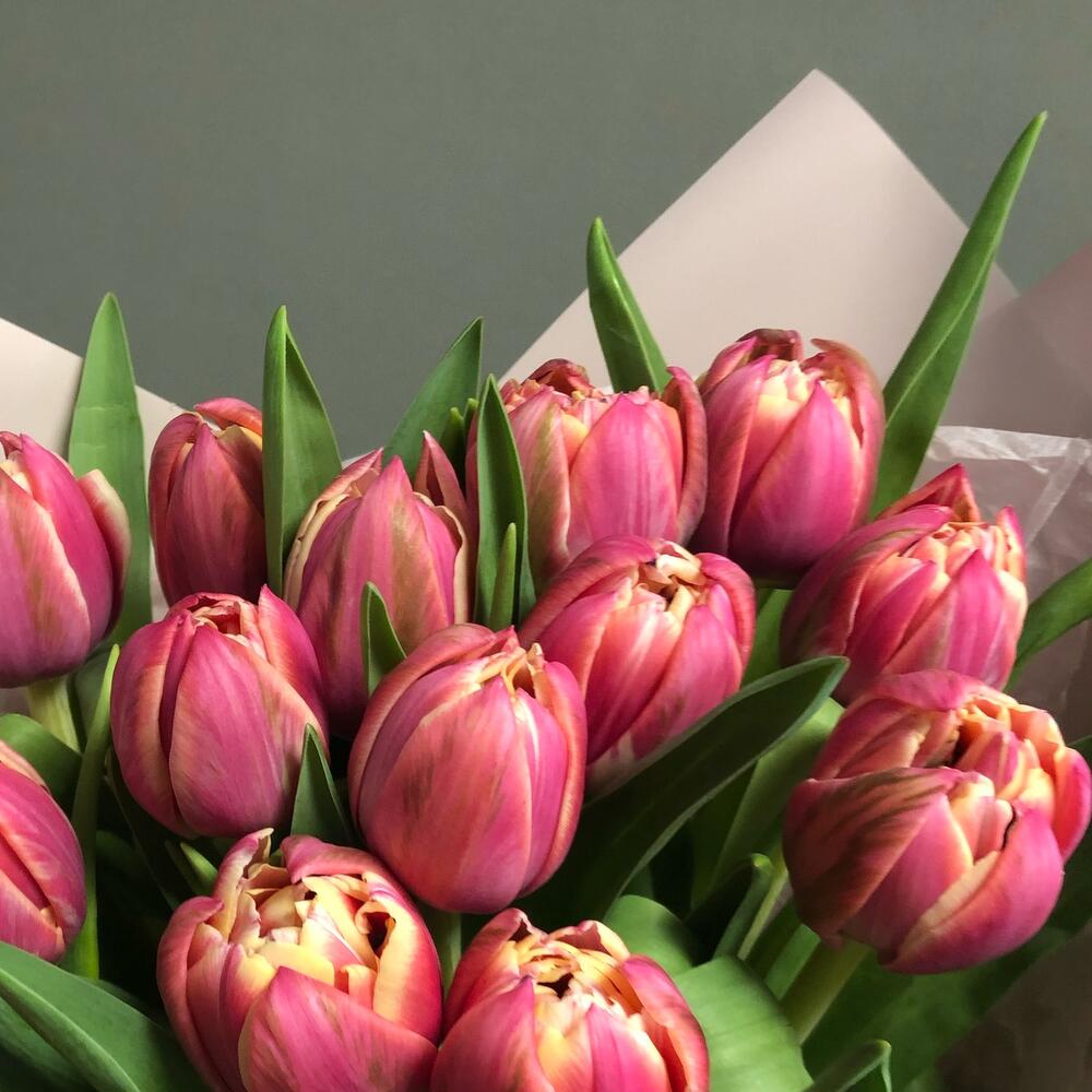 Букет из 25 тюльпанов пионовидных микс в дизайнерской упаковке