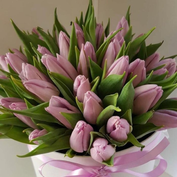 Тюльпан розовый – 51 шт.Коробка шляпная – 1 шт.Лента атласная – 2 шт.Открыточка с вашими пожеланиями – 1 шт.хорошее настроение – 100 шт.инструкция по уходу за цветами – 1 шт.Кризал – 1 шт.
