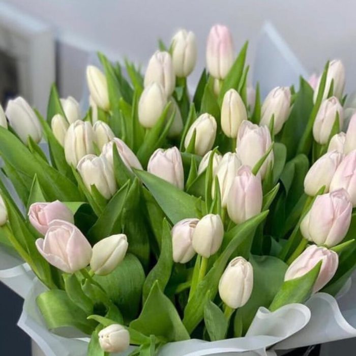 тюльпаны белые – 51 шт.Коробка шляпная – 1 шт.Упаковка дизайнерская – 1 шт.Лента атласная – 1 шт.Открытка – 1 шт.инструкция по уходу за цветами – 1 шт.хорошее настроение – 100 шт.Кризал – 1 шт.