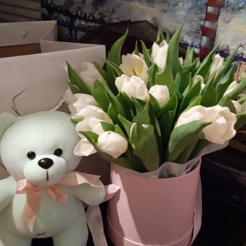 Нежные тюльпаны в шляпной коробке с невероятно милым мишкой Для самой милой и любимой девушки Такой подарок будет радовать девушку очень долго, ведь тюльпаны являются одним из самых стойких цветов Медвежонок … невероятно мягкий, приятный на ощупь , ваша девушка … Показать ещёпросто не сможет выпускать его из своих объятий