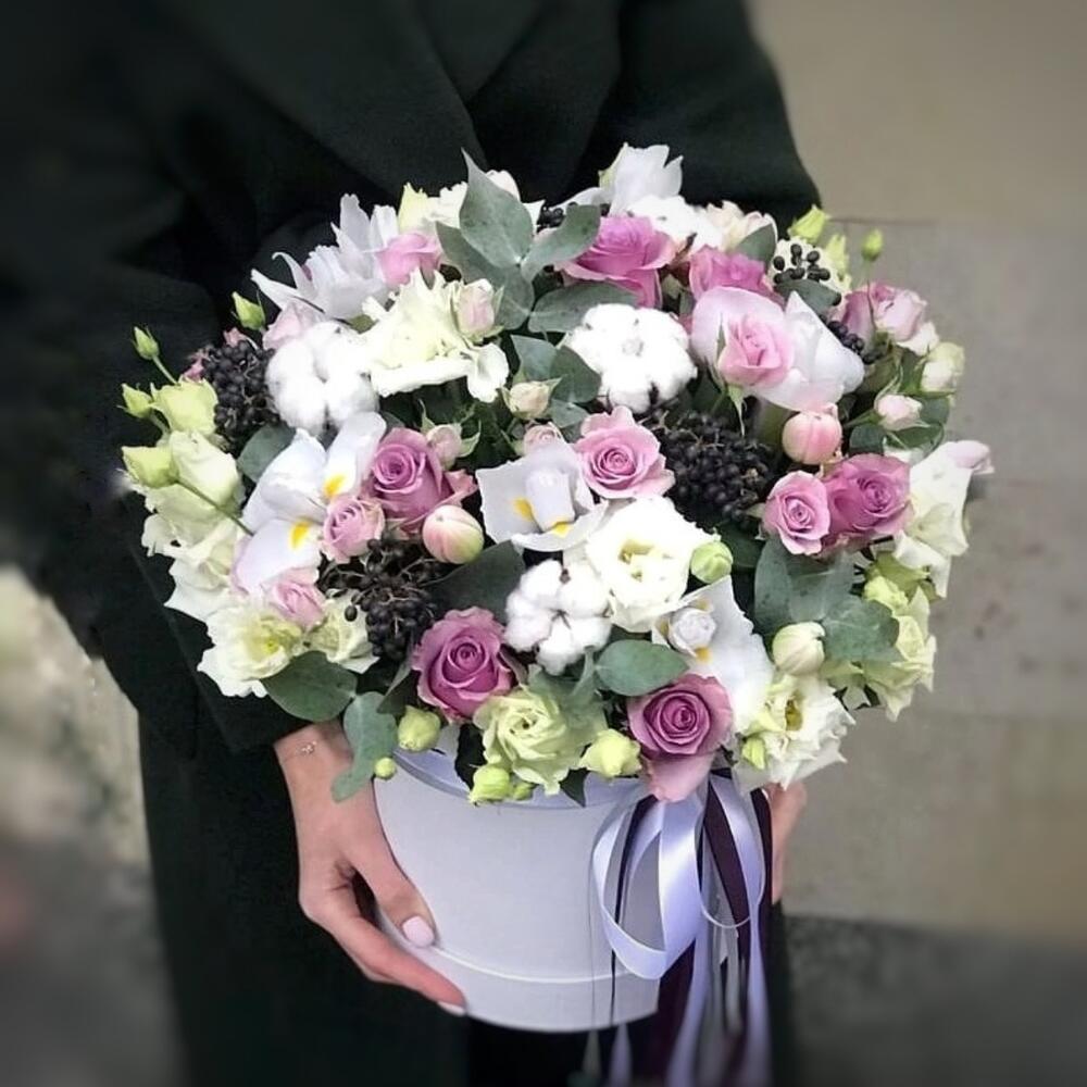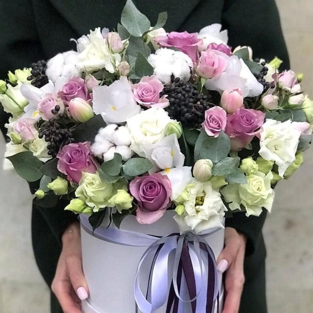 Коробка шляпная – 1 шт.Оазис флористический – 1 шт.Лента атласная – 3 шт.Эвкалипт – 6 шт.Роза – 7 шт.Роза кустовая – 3 шт.Хлопок натуральный – 5 шт.Ирис – 6 шт.Эустома – 3 шт.Ягоды вибурнум – 3 шт.Тюльпан – 9 шт.